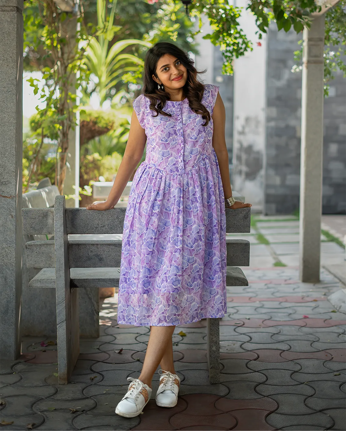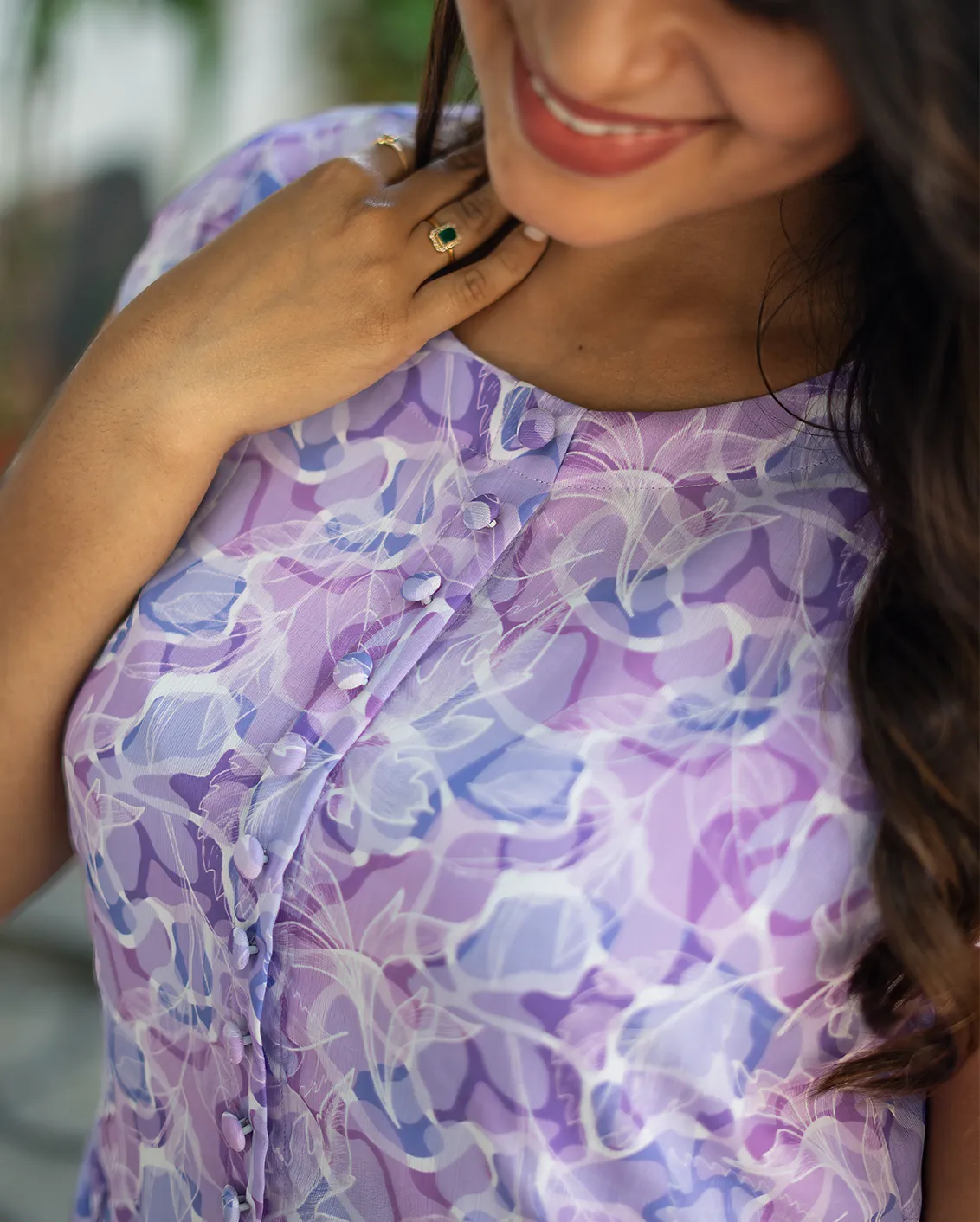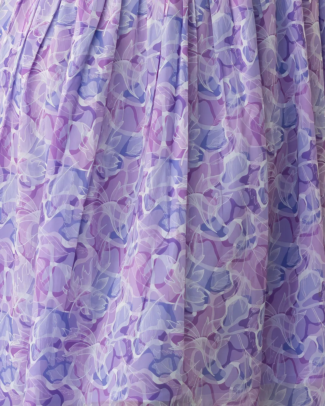 Crafted from lightweight orange chiffon — breathable, soft, and beautifully fluid for an effortless all-day wear. This vintage-inspired midi features a round neckline, fitted bodice with pearlised button placket, and delicate cap sleeves, flaring into a full A-line skirt with a corseted basque waist. Dreamy lavender floral print, concealed back zip.