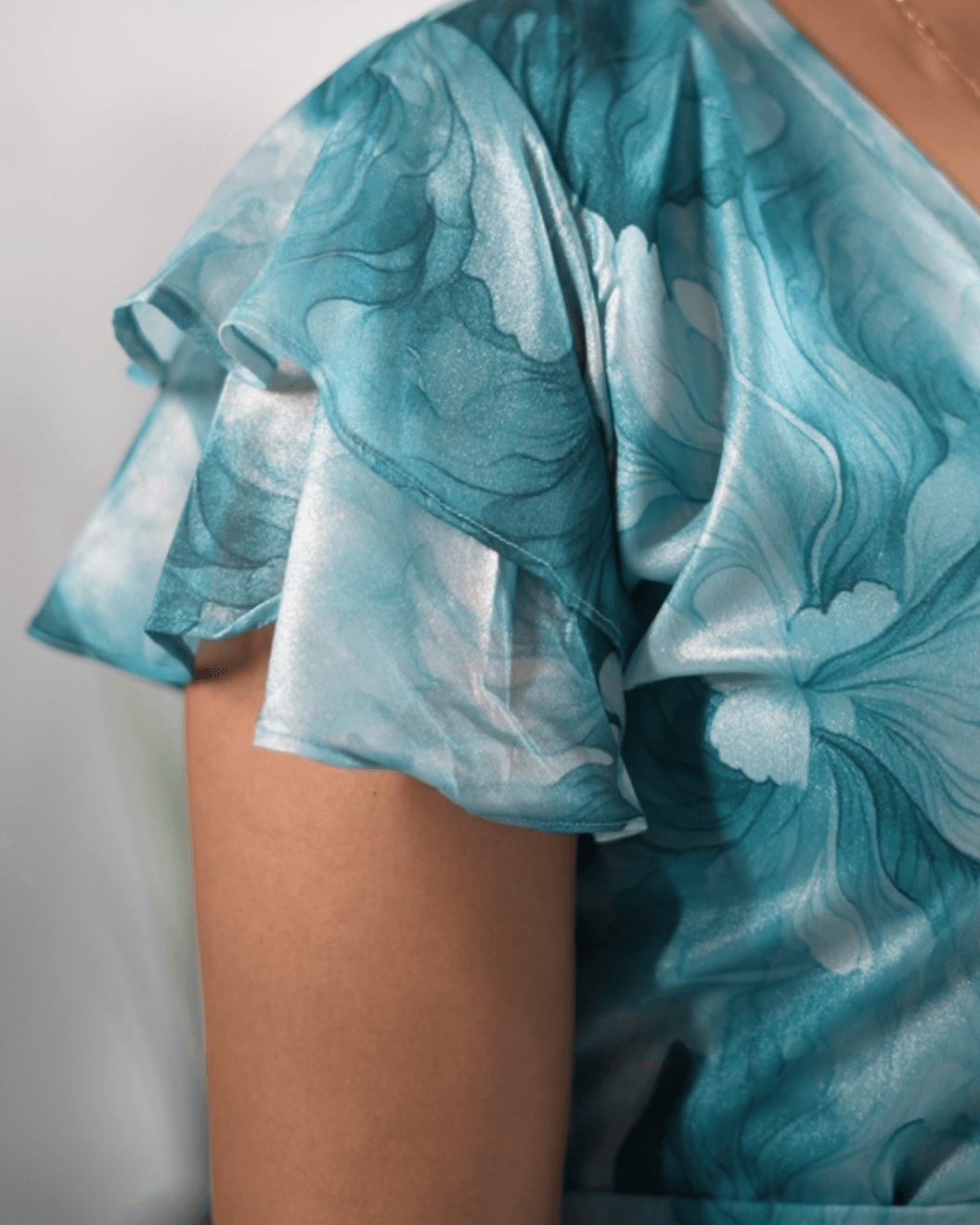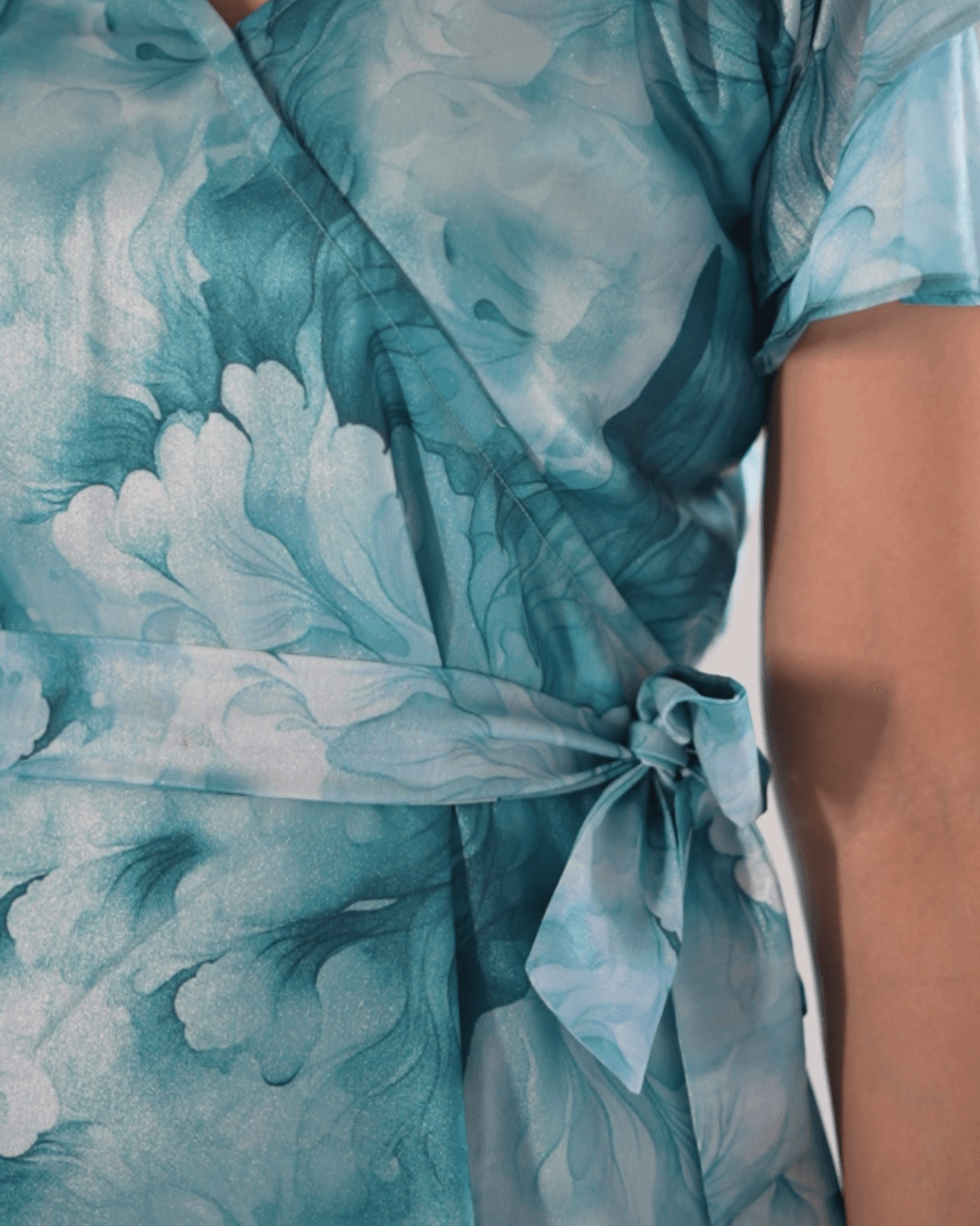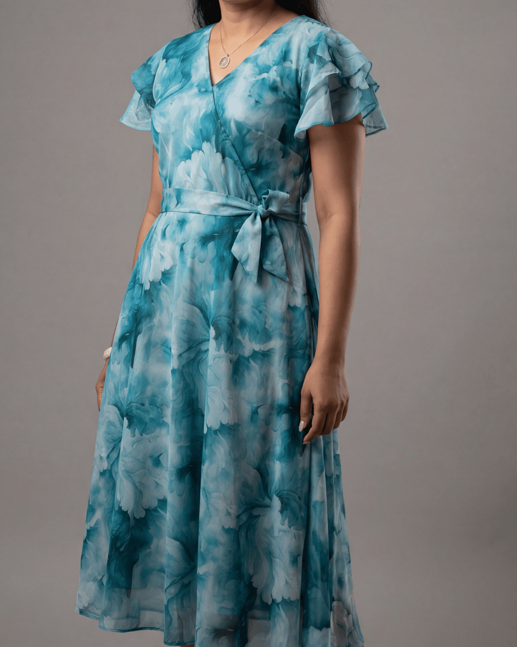 This ethereal A Line wrap dress stitched together in the front offering a lightweight, airy drape with a subtle, luminous finish. The silhouette features a graceful surplice V-neckline and a self-tie belt that defines the waist, leading into a flared skirt with delicate flutter sleeves.